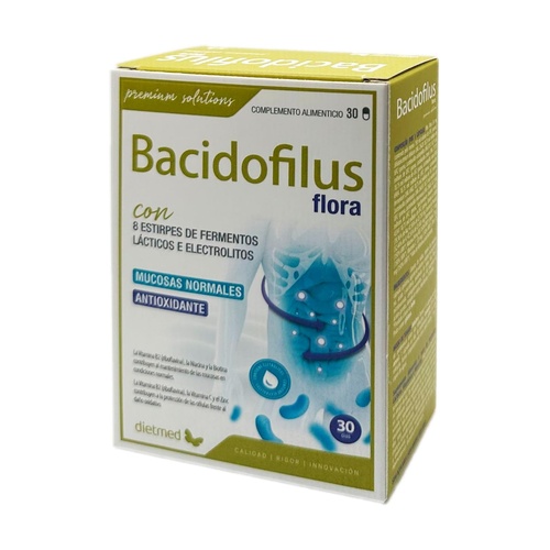 Mix Flora (8 mg)(150 miliard CFU/gram)(Bifidobacterium bifidum LMG 25628 18,75 miliard CFU/gram, Lactobacillus acidophillus LMG 8151 18,75 miliard CFU/gram, Lactobacillus brevis LMG 27275 18,75 miliard CFU/gram, Lactobacillus casei LMG 6904 18,75 miliard CFU/gram, Lactobacillus fermentum LMG 6902 18,75 miliard CFU/gram, Lactobacillus plantarum LMG 26655 18,75 miliard CFU/gram, Lactobacillus rhamnosus LMG 25626 18,75 miliard CFU/gram, Saccharomyces boulardii MUCL 43341 18,75 miliard CFU/gram), Chlorid sodný (250 mg), Chlorid draselný (150 mg), vitamín B2 (0,7 mg), niacin (8 mg), biotin (25 μg), vitamín C (40 mg), zinek (5 mg).