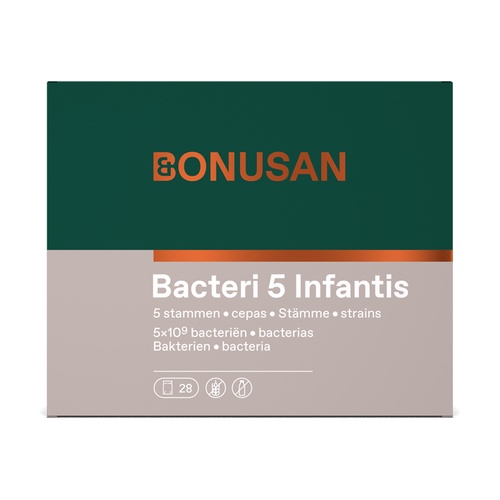 Bacteri 5 Infantis je jedinečný širokospektrální produkt, který nabízí 5 bakteriálních kmenů. Kompletní složení bylo speciálně formulováno pro kojence a malé děti; může být používáno i samotnou matkou (před a až 6 měsíců po porodu). Všechny kmeny prošly důkladným výzkumem: bylo prokázáno, že jejich použití je bezpečné.