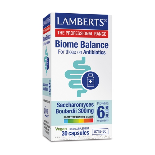 Biome Balance Antibiotics od Lamberts obsahuje Saccharomyces boulardii, kvasinku odolnou vůči účinkům antibiotik, což ji činí ideální pro užívání spolu s tímto lékem. Byla také široce zkoumána a je populární jako doplněk pro cestovatele do zahraničí. Saccharomyces boulardii je mikroorganismus, který se liší od známých probiotických druhů, jako je acidophilus, tím, že místo bakterie je ve skutečnosti přirozená „přátelská“ kvasinka. Je odolná vůči žaludeční kyselosti a přežívá při tělesné teplotě (37 stupňů Celsia). Je pojmenována podle francouzského vědce Boulardiiho, který pozoroval, že domorodci z některých zemí jihovýchodní Asie žvýkali kůru liči a mangostanu k potlačení průjmu a dalších příznaků spojených s cholerou.