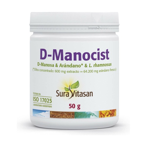 D-Manocist od Sura Vitasan je doplněk stravy vyrobený na bázi D-manózy, přírodního cukru bez vlivu na metabolismus glukózy, ultra koncentrovaného extraktu z brusinek (107:1), který poskytuje 600 mg odpovídajících 64,2 g na dávku, a Lactobacillus rhamnosus.
