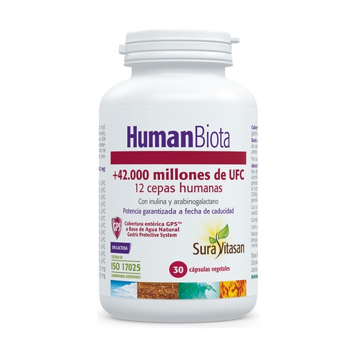 Human Biota od Sura Vitasan obsahuje více než 42 miliard CFU, s 12 prospěšnými kmeny lidského původu spolu s doplňkovými prebiotiky přírodního původu inulinem (čekanka) a A.O.S. (modřín).