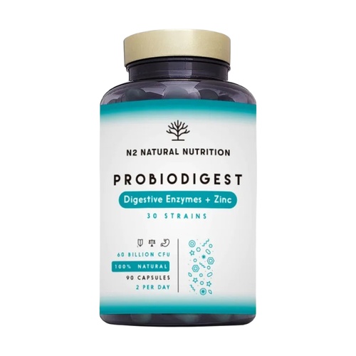 Probiodigest od N2 Nutrition je širokospektrální symbiotický doplněk stravy s 30 probiotickými kmeny, zinkem a trávicími enzymy pro podporu zdraví vašeho střevního traktu.