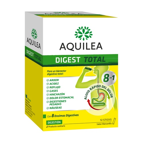 Aquilea Digest Total je multisymptomatický přípravek, který rychle působí proti 8 trávicím symptomům: pálení žáhy, pálení, reflux, plynatost, nadýmání, bolest žaludku, těžké trávení a nevolnost. To vše díky účinné kombinaci složek a 8 trávicích enzymů.