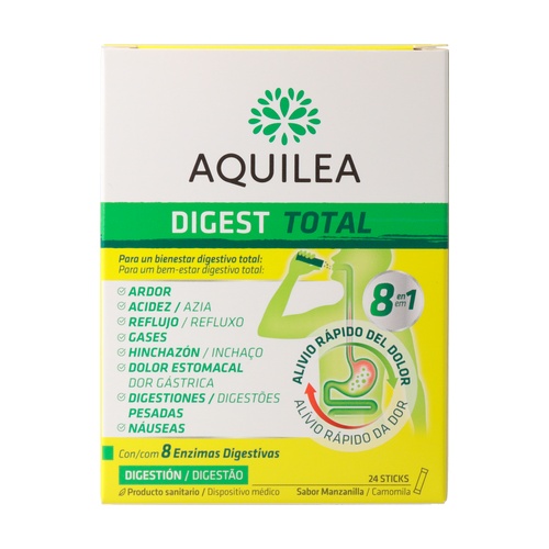 Aquilea Digest Total je multisymptomatický přípravek, který rychle působí proti 8 trávicím symptomům: pálení žáhy, pálení, reflux, plynatost, nadýmání, nepohodlí v žaludku, těžké trávení a nevolnost. To vše díky účinné kombinaci ingrediencí a 8 trávicích enzymů.
