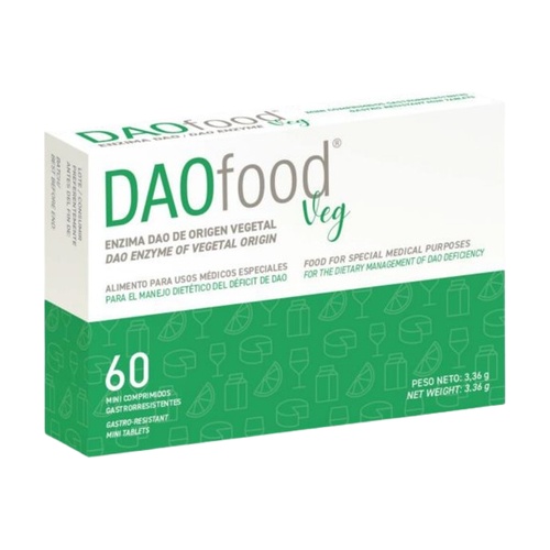 Diaminoxidáza (DAO) v DAOfood® Veg doplňuje vlastní enzym organismu, který metabolizuje histamin. Užíváním jedné tablety DAOfood® Veg před každým jídlem se zvyšuje množství DAO v tenkém střevě a tím i schopnost degradovat histamin. To urychluje zpracování histaminu v trávicím traktu, který je spouštěčem příznaků.