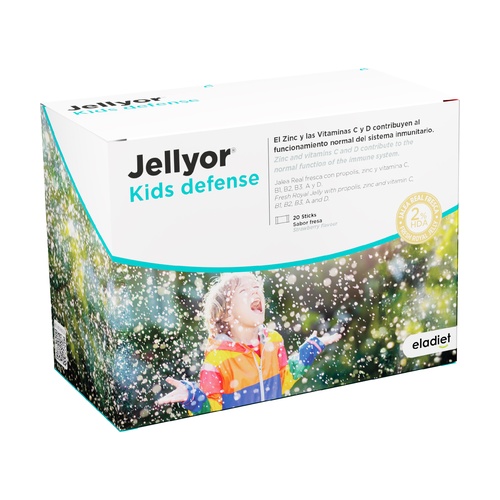 Jellyor Kids defense od Eladiet je tekutý doplněk stravy na bázi čerstvého mateří kašičky (500 mg) s propolisem, zinkem a vitamíny C, B1, B2, B3, A a D.