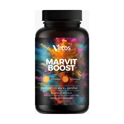 Multivitamin Marvit Boost + Q10 + Maca + Ginseng od Vecos je doplněk stravy, který pomáhá posílit imunitní systém, poskytuje energetický impuls a má antioxidační vlastnosti.