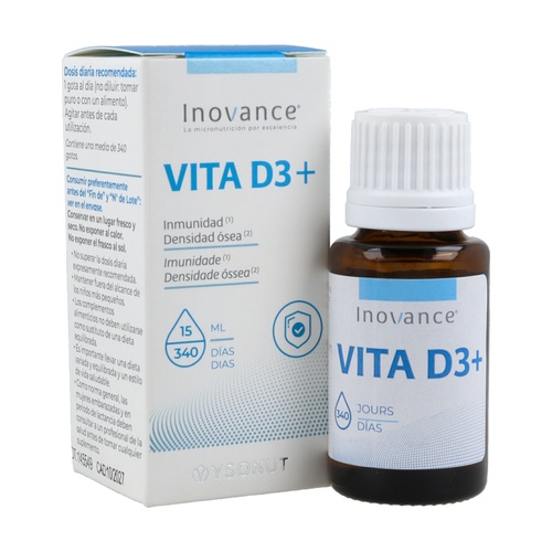 Vita D3+ od Inovance je doplněk stravy založený na vitamínu D3 pocházejícím z lanolinu (extrahovaného z ovčí vlny).