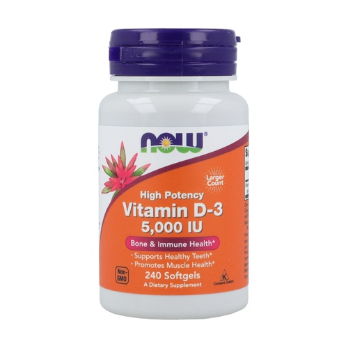 Vitamin D-3 5000 IU od Now je ve formě měkkého gelu s vysokou vstřebatelností. Vitamin D se obvykle získává z potravy nebo je produkován kůží z ultrafialové energie slunce. Nicméně není hojně přítomen v potravinách.