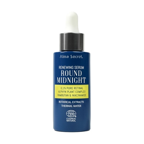 Sérum Round Midnight s 0,1% čistým retinalem a niacinamidem od Alma Secret je vysoce účinná kúra, která obnovuje, sjednocuje tón pleti, zpevňuje, vyhlazuje vrásky a omlazuje. Formulováno s novou generací čistého retinalu s vícevrstvým enkapsulováním (0,1%), který je až 15krát účinnější než jiné retinaly. Kombinuje niacinamid s rambutánem a komplexem 7 švýcarských alpských rostlin pro redukci skvrn, rozjasnění, hydrataci, zklidnění a minimalizaci pórů.