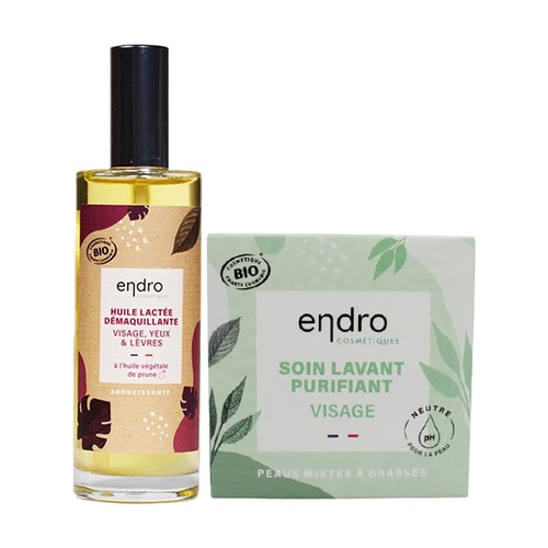 Balíček Rutina dvojitého čištění od Endro Cosmétiques obsahuje čisticí pleťový gel 85 ml a jemný odličovací čisticí olej 100 ml pro efektivní dvojité čištění, zejména pro mastnou pleť.
