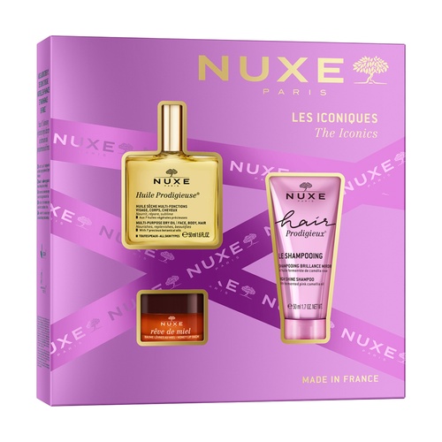 Objevte tři ikonické péče Nuxe k probuzení vašich smyslů. Tento ikonický set obsahuje: Huile Prodigieuse® 50ml, Hair Prodigieux® Šampon Zrcadlový Lesk 50ml, Rêve de Miel Balzám na rty s medem ultra výživný a regenerační 15g.