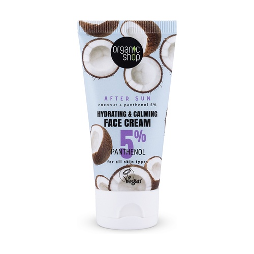 Hydratační a zklidňující pleťový krém aftersún kokos + 5% pantenolu od Organic Shop je lehký a osvěžující krém po opalování vhodný pro všechny typy pleti, který pomáhá obnovit a oživit pokožku po slunečním záření. Jeho pečlivě vyvinuté složení s kokosovým olejem a pantenolem hluboce hydratuje pokožku, zklidňuje ji a zabraňuje jejímu vysušení vlivem UV paprsků.