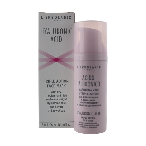 Maska na obličej s trojitou akcí s kyselinou hyaluronovou od Erbolario je krémová péče na obličej s nízkomolekulární, středněmolekulární a vysokomolekulární kyselinou hyaluronovou a extraktem z řasy sněžné.
