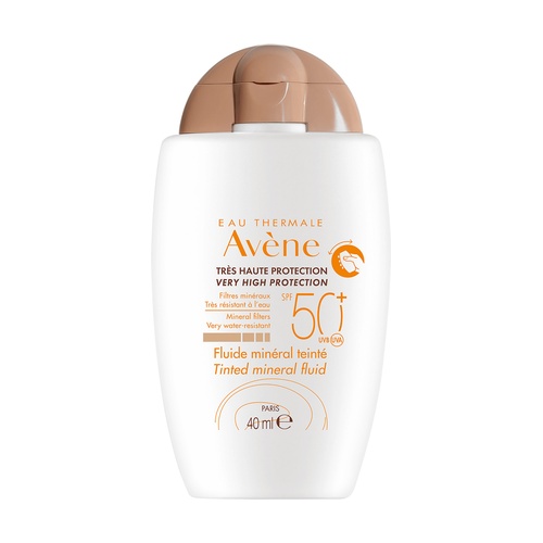 Minerální fluid SPF50+ s barvivem Avène nabízí velmi vysokou ochranu obličeje před sluncem. Širokospektrální UVB-UVA ochrana.