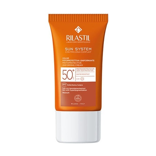 Sun system 50+ barevná emulze od Rilastil je fotoprotektivní emulze s barvou pro obličej, krk a dekolt. Určeno pro citlivou a intolerantní pokožku. Snadno se roztírá a okamžitě vstřebává, zajišťuje maximální komfort a garantuje velmi vysokou ochranu proti záření širokého spektra UVB-UVA.