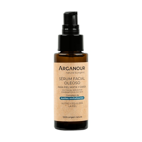 Obličejové sérum pro mastnou pleť od Arganour, účinná obličejová kúra založená na přírodních suchých a výživných bio-olejích, které hluboce hydratují pokožku, aniž by zanechaly mastný zbytek.