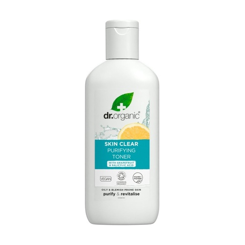 Organic SkinClear Toner od Dr. Organic je čisticí tonikum pro mastnou a nečistou pleť, obohacené o přírodní AHA (ovocné kyseliny) a kyselinu salicylovou, které přispívají k jemnému a přirozenému exfoliačnímu účinku podporujícímu obnovu buněk.