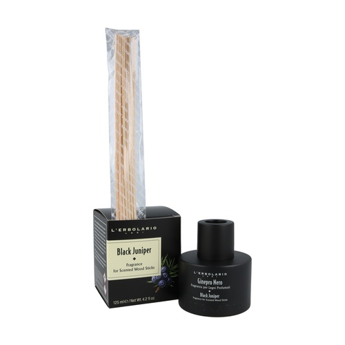 Vonný dřevěný olej Juniper Black od L'erbolario ponořením ratanových tyčí do vonného roztoku, symfonie Black Juniper, s jejími citrusovými a dřevitými tóny