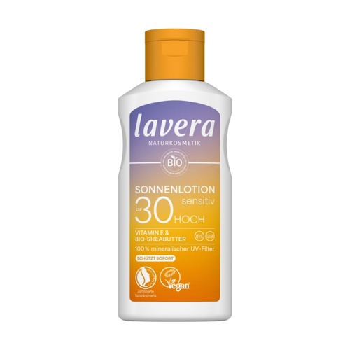 Opalovací mléko sensitive SPF30 od Lavera je vyvinuto s 100% minerálním UV filtrem a nejlepšími přírodními ingrediencemi, spolehlivě chrání proti UVA a UVB paprskům ihned po aplikaci a snižuje riziko podráždění pokožky. Vitamín E chrání a organické bambucké máslo poskytuje intenzivní péči.