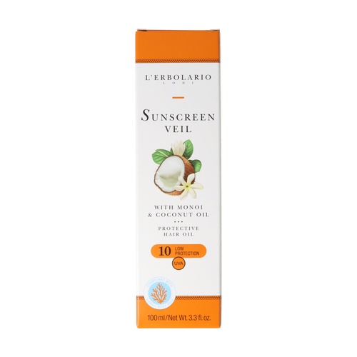 Sluneční sprej Neviditelný závoj Kokos SPF10 od L'Erbolario Sluneční olejový sprej bez plynu s nízkou ochranou pro vlasy s Monoi a kokosovým olejem. Ochranný a lesklý