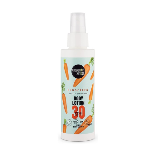 Tělové mléko s ochranným faktorem mrkev + antioxidanty spf30 od Organic Shop má nemastnou a voděodolnou texturu s SPF 30, snadno se vstřebává a poskytuje pokožce spolehlivou ochranu před účinky slunečního záření.