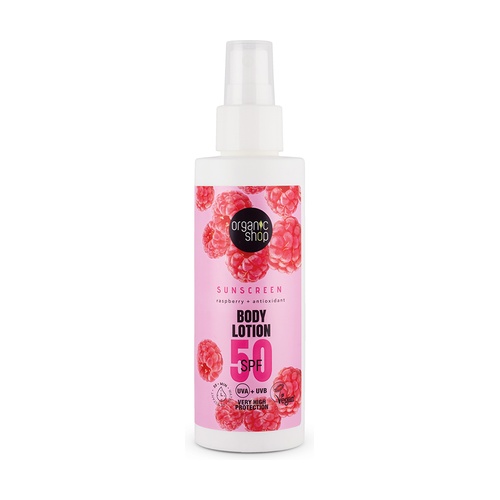 Tělové mléko s ochranným faktorem malina + antioxidanty spf50 od Organic Shop poskytuje vysokou ochranu s SPF 50, je voděodolné až 30 minut a je určeno k prevenci spálení způsobených slunečním zářením.