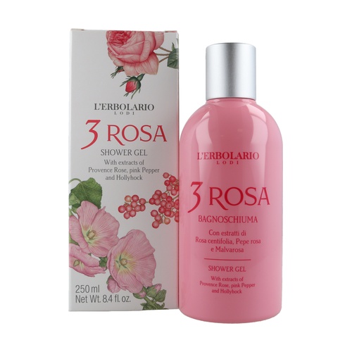 3 Růžový sprchový gel L'erbolario vonný sprchový gel s uklidňující a ochrannou silou díky vzácným tekutým extraktům získaným z bobulí růžového pepře a květů růže stolisté a svízelu růžového