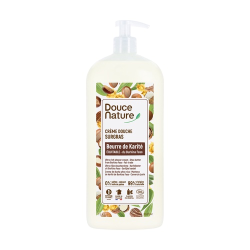Bio sprchový krém s přebytkem lipidů od Douce Nature je péče s jemnou mycí bází bez sulfátů, bez palmového oleje a bez Cocamidopropyl betainu, speciálně navržená pro suchou pokožku. Jeho formule obsahuje bio a fair trade bambucké máslo z Burkiny Faso, které je známé tím, že hluboce vyživuje epidermis a uklidňuje napjatou pokožku.
