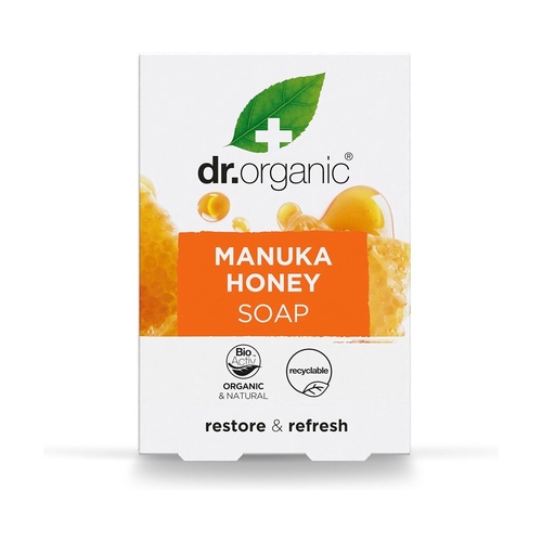 Dr. Organic Manukový medový mýdlo je jemný a něžný rostlinný mýdlový blok se všemi regeneračními a opravnými vlastnostmi manukového medu.