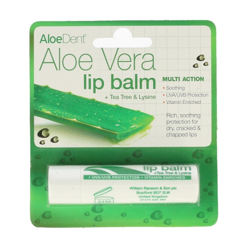 Aloe Vera, Cera alba (včelí vosk), Esenciální olej z čajovníku, Lysin / L-Lysin, Ricinus Communis (ricinový olej), Euphorbia Cerifera (vosk Candelilla), Copernicia Cerifera (vosk Carnauba) / Carnauba vosk, Tocopherol, Jojoba / Simmondsia chinensis, Cajeput / Melaleuca, Ketoestearilalkohol (Cetearyl Alcohol), Mentol, Panthenol, Oxid titaničitý, Octylmetoxycinnamát.