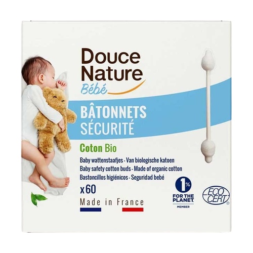Hygienické tyčinky Serguridad bebe od Douce Nature, tyčinky z bavlny, nebělené chlórem, bělené peroxidem vodíku. Zvláště navrženy pro bezpečné čištění zvukovodu dítěte.