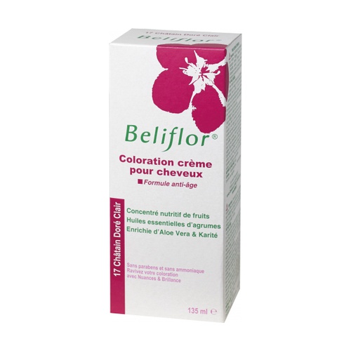 Barva č. 17 Světle zlatavě kaštanová od Beliflor patří do kategorie permanentních barev, avšak liší se složením bez amoniaku a bez parabenů. Proniká do vlasového vlákna a dokonale zakrývá šedé vlasy. Umožňuje zesvětlit nebo ztmavit barvu až o 3 odstíny.