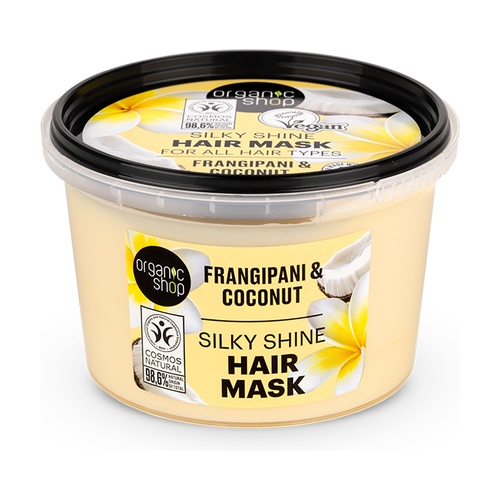 Maska na vlasy s hedvábným leskem frangipani a kokosem od Organic Shop je výživná vlasová maska nasáklá zklidňující esencí frangipani a hydratační silou kokosu.