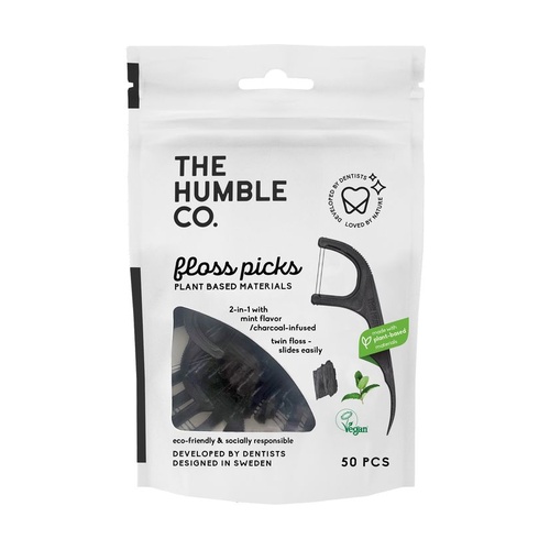 Držák dentální nitě + párátko s uhlíkem a mátou 50 ks od Humble Brush, s dvojitým závitem účinně odstraňuje zbytky jídla, zatímco tvar párátka usnadňuje přístup do těžko dostupných míst.