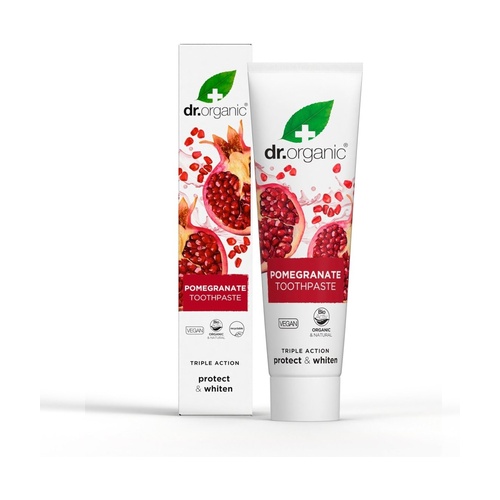 Organická granátová zubní pasta Dr. Organic je produkt, který omlazuje a obnovuje dásně a zuby, zároveň zanechává ústa čistá a ovocná s pocitem svěžesti máty.