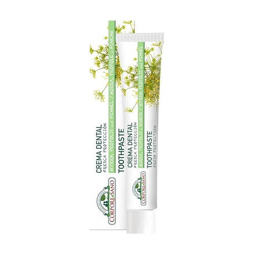 Zubní pasta s myrhou, propolisem a fenyklovým olejem od Corpore Sano je zubní krém, který poskytuje důkladné čištění zubů, aniž by poškodil zubní sklovinu. Její přírodní extrakty jí dodávají čistící, aromatizující a posilující vlastnosti pro dásně.