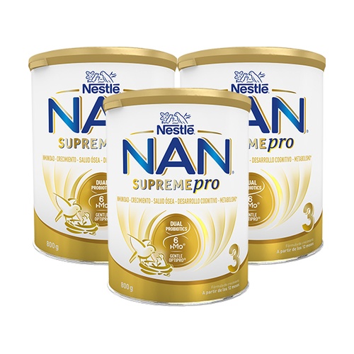 NAN Supreme pro 3 od Nestlé je růstové mléko od 1 roku věku. Nejpokročilejší formule pro děti, založená na výzkumu Nestlé o imunitě, trávení a metabolismu. První a jediná formule s: 6 HMO, oligosacharidy strukturálně identické s těmi v mateřském mléce, které živí probiotika pro zdravou mikrobiotu. DUÁLNÍ PROBIOTIKA. S probiotiky B. lactis a B. infantis, přítomným u dětí krmených mateřským mlékem. JEMNÝ OPTIPRO®, jedinečný technologický proces pro získání exkluzivní optimalizované směsi částečně hydrolyzovaných proteinů.