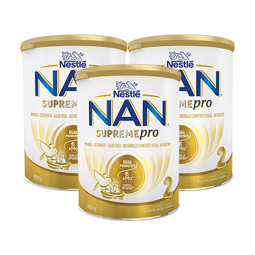 NAN Supreme pro 2 od Nestlé je pokračovací mléko pro děti od 6 měsíců, které pomáhá dodat potřebné živiny pro jejich vývoj. Je to nejpokročilejší kojenecká formule založená na výzkumu Nestlé o imunitě, trávení a metabolismu, které jsou klíčové pro budoucí zdraví. První a jediná formule s: 6 HMO, oligosacharidy strukturálně identické s těmi v mateřském mléce, které vyživují probiotika pro zdravou mikrobiotu. DUÁLNÍ PROBIOTIKA. Kombinace 2 probiotik: B. lactis a B. infantis, přičemž poslední je přítomné u dětí krmených mateřským mlékem. JEMNÝ OPTIPRO, unikátní technologický proces pro dosažení exkluzivní optimalizované směsi částečně hydrolyzovaných bílkovin.