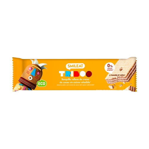 Objevte oplatku TRIBOO plněnou čokoládou od Smileat, křupavou ekologickou a chutnou svačinku, ideální pro ty nejmenší.