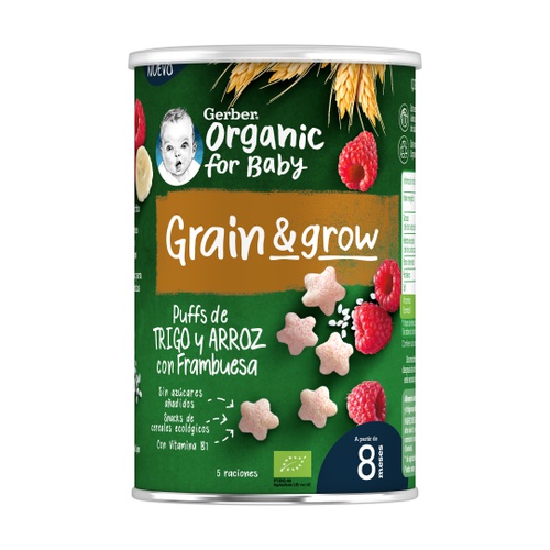 Gerber NutriPuffs Snack BIO z cereálií a malin je potravina vyrobená na bázi cereálií. Ekologická svačinka na bázi rýže a pšenice s banánem a malinami.