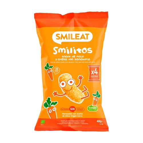 Smilitos od Smileat jsou ekologická a křupavá svačinka vyrobená z kukuřičné krupice, celozrnné ovesné mouky, práškové mrkve a extra panenského olivového oleje, ideální pro děti od 8 měsíců.