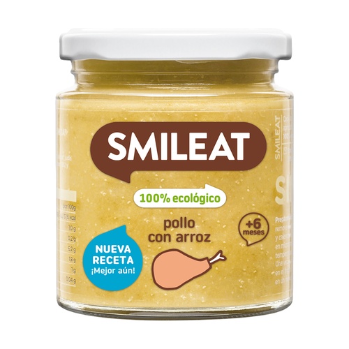 Tarrito de Pollo con Arroz Eco (6 meses) od Smileat je tato slaná dětská kaše výsledkem dokonalé kombinace kuřete, rýže a zeleniny, vyrobená z nejlepších surovin pocházejících ze španělského ekologického zemědělství, 100% přírodní, bez přidaných cukrů a solí, bez konzervantů a zahušťovadel, stejně jako všechny naše dětské kaše.