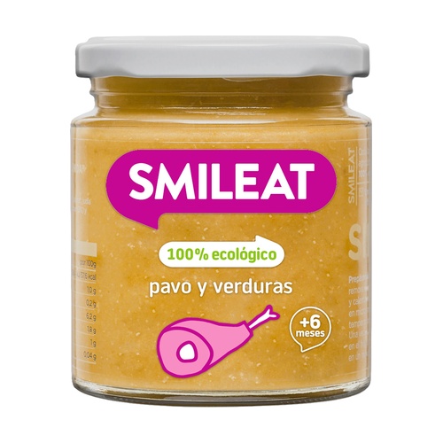 Bio zeleninové a krůtí pyré Smileat je dokonalou kombinací krůty a zeleniny, vyrobené z nejlepších sezónních surovin pocházejících z ekologického španělského zemědělství, 100 % přírodní, bez lepku, bez přidaných cukrů či solí, bez konzervantů a zahušťovadel.