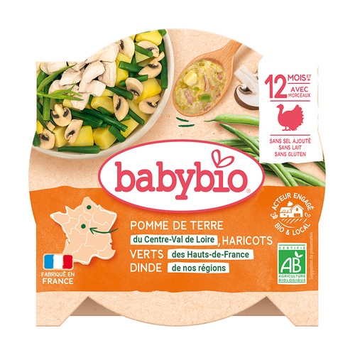 Brambory z oblasti Centre-Val de Loire* 44 %, voda z vaření, zelené fazolky z Hauts-de-France* 15 %, krůtí maso z Francie* 8 %, cibule z Francie* 7 %, houby*, extra panenský olivový olej*, petržel z Francie*, estragon*.