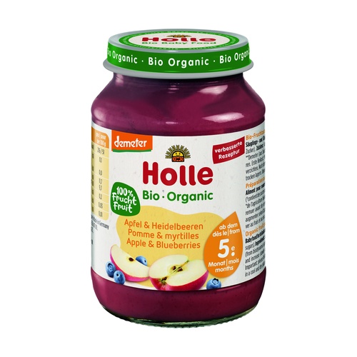 Bio pyré z jablka a borůvky z lesa Holle jsou jednotlivá, stejně jako Pure Apple a Pure Pear, mají jemnou chuť a jsou ideální při začátku odstavení. Jsou z biodynamického zemědělství.