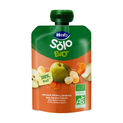 Sáček Jablko, Banán a Mrkev Eco od Hero Solo na bázi jablka, banánu a mrkve, vyrobený ze 100% ekologických surovin, nutričně přizpůsobený pro vaše miminko i pro všechny ostatní.