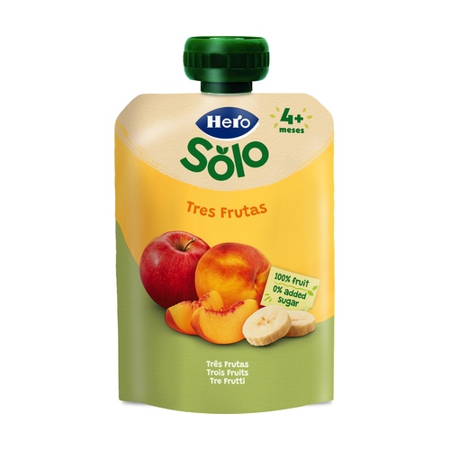 Ovocný sáček se třemi druhy ovoce od Hero je vyroben z jablka, banánu a broskve. Přirozený a výživný výběr od 4 měsíců.
