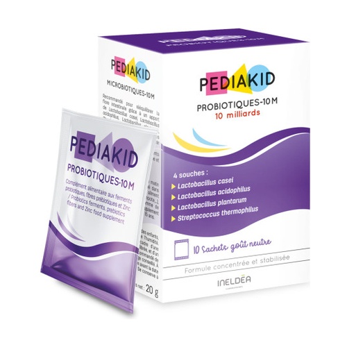 PEDIAKID Probiótika-10M bylo vyvinuto na základě mléčných fermentů (Lactobacillus casei, Lactobacillus acidophilus, Lactobacillus plantarum, Streptococcus thermophilus) pečlivě vybraných k obnovení rovnováhy střevní mikroflóry. Jeho formule s inulinem z čekanky přispívá k růstu prospěšných bakterií ve střevě.