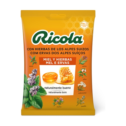 Cukr, glukózový sirup, med (5 %), extrakt (1,2 %) z bylinkové směsi Ricola, přírodní aroma, barvivo (přírodní karamel), esenciální oleje z máty, mentol, povrchově aktivní látka (arabská guma).